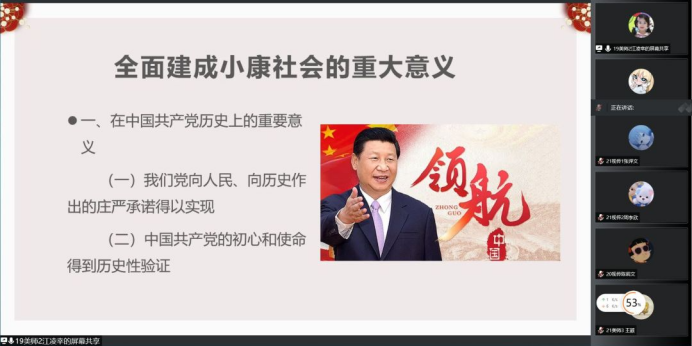 本次微党课的主题围绕“全面建成小康社会”展开,主讲人从全面建成小康社会的基本标准、重大意义、习近平语录、小康社会征程中的温州等方面展开,让我清晰地了解到全面建成小康社会为我们社会、我们国家的发展注入了动力。现如今,公路、铁路四通八达,这是科技的进步,是“小康社会”给我们带来的便利。温州——一座充满幸福感的城市,在小康社会的征程中不断探索创新,走好自己的道路。通过本次微党课,我发现:当我走出校园时,整个社会更加和谐有序,不良现象慢慢减少,这是小康社会为我们带来的改变。在小康社会下,受益的是我们国家,更是我们自己,我们要以榜样为镜,向他们学习。