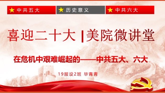 本期“喜迎二十大 美院微讲堂”活动由温大美院的党员毕青青以《在危机中艰难崛起的——中共五大、六大》为主题开展,向我们阐述了中共五大和六大召开时间仅隔一年的原因以及两次会议的历史意义。这两个会议基本上统一了全党思想,对克服党内存在的“左”倾情绪,摆脱被动局面,实现工作的转变,对中国革命的复兴和发展,起了积极的作用。