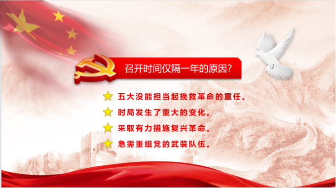 四、急需重组党的武装队伍:“四一二”蒋介石发动政变后,特别是“七一五”汪精卫背叛革命后,这两个反动势力聚集到一起大量的屠杀共产党员,破坏共产党的组织。在这时候中央机关受到了很大的破坏,各个省的党组织基本上被破坏的差不多。党员的数量也有59,000多人下降到一万多人,而且这一万多人很多都找不到组织,联系不上,这个情况对革命斗争的户型非常不利,没有党的组织没有党员的这个奋斗革命怎么搞的起来呢?这也需要召开次代表大会来重组党的组织。