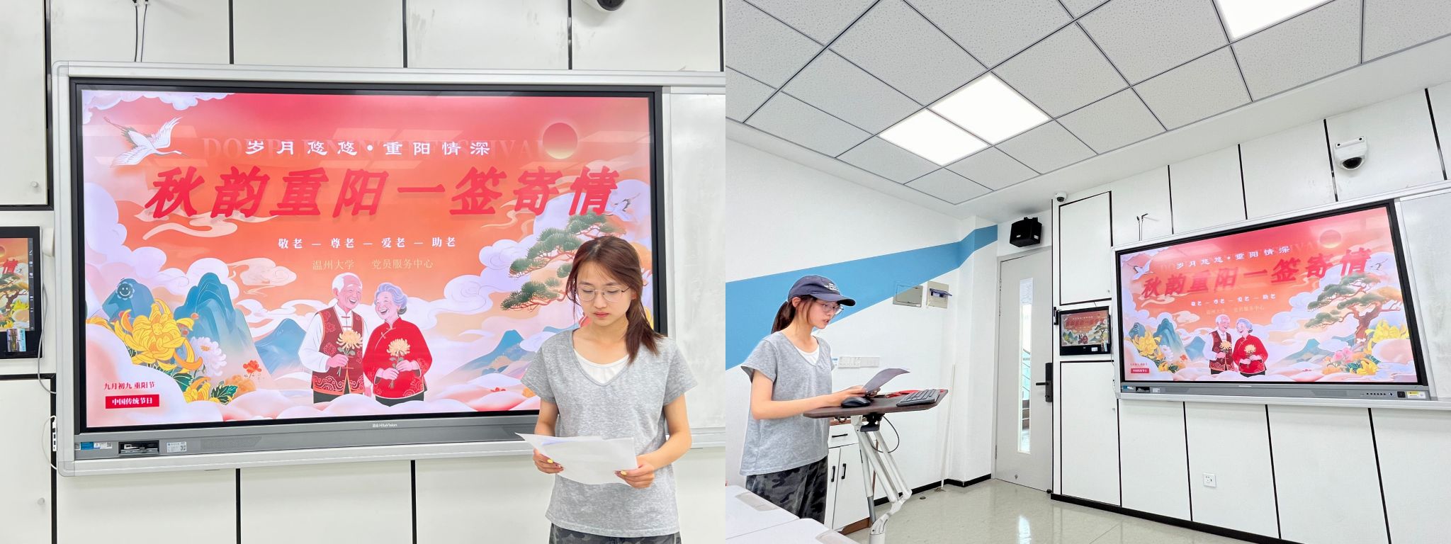 活动伊始,主持人以“重阳节的文化脉络”为开篇。她指出,传承重阳文化的核心在于弘扬敬老崇老的道德风尚,这也正是“立德树人”根本任务的生动实践。通过她的讲解,同学们对重阳节与美德文化之间的深刻联系有了更为清晰的认识。