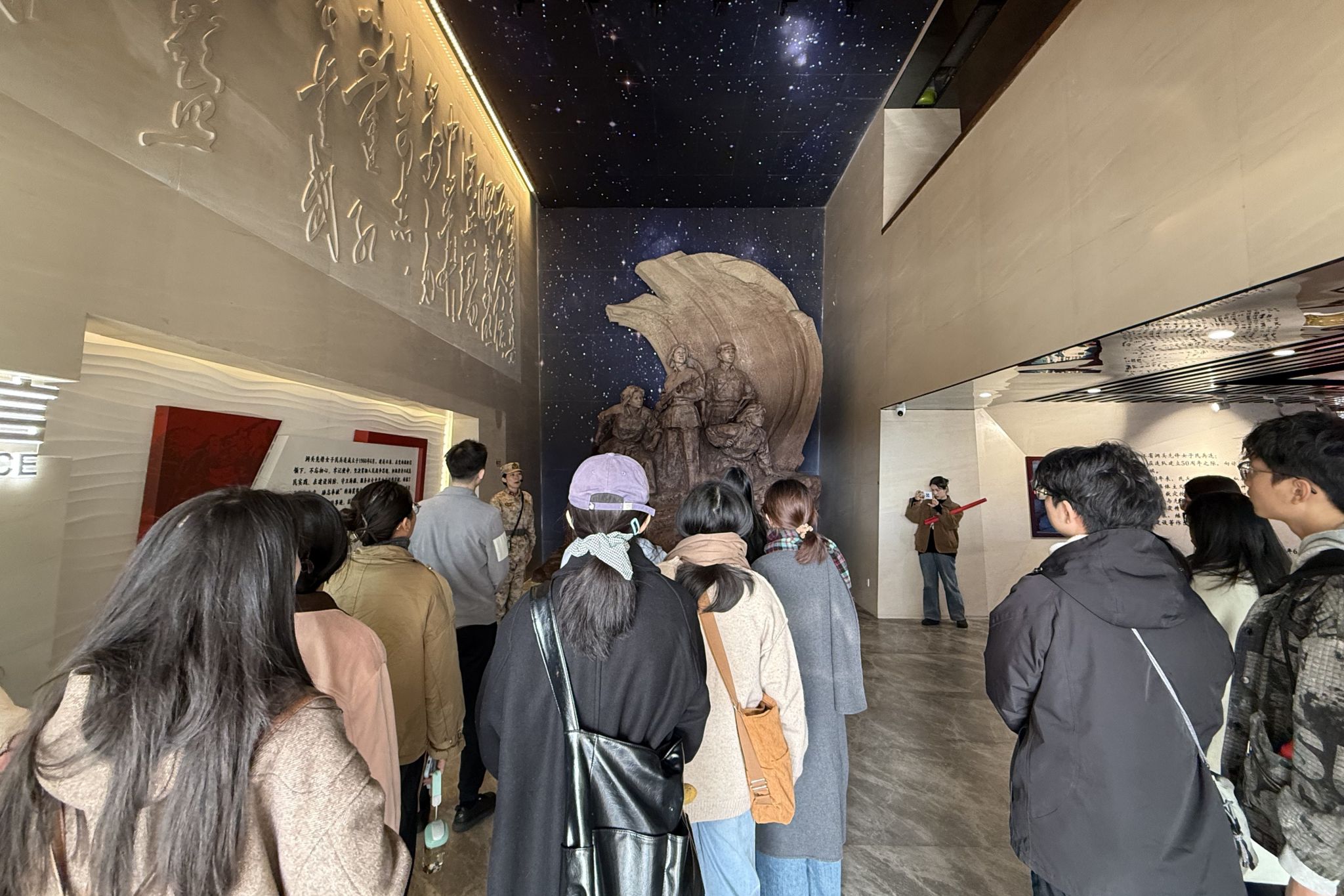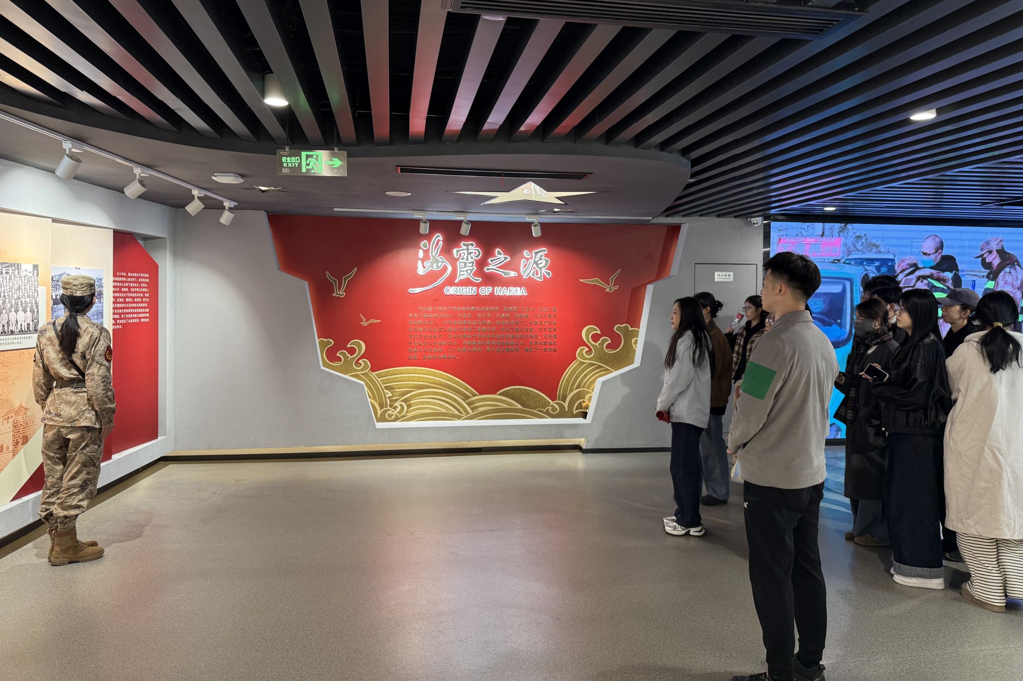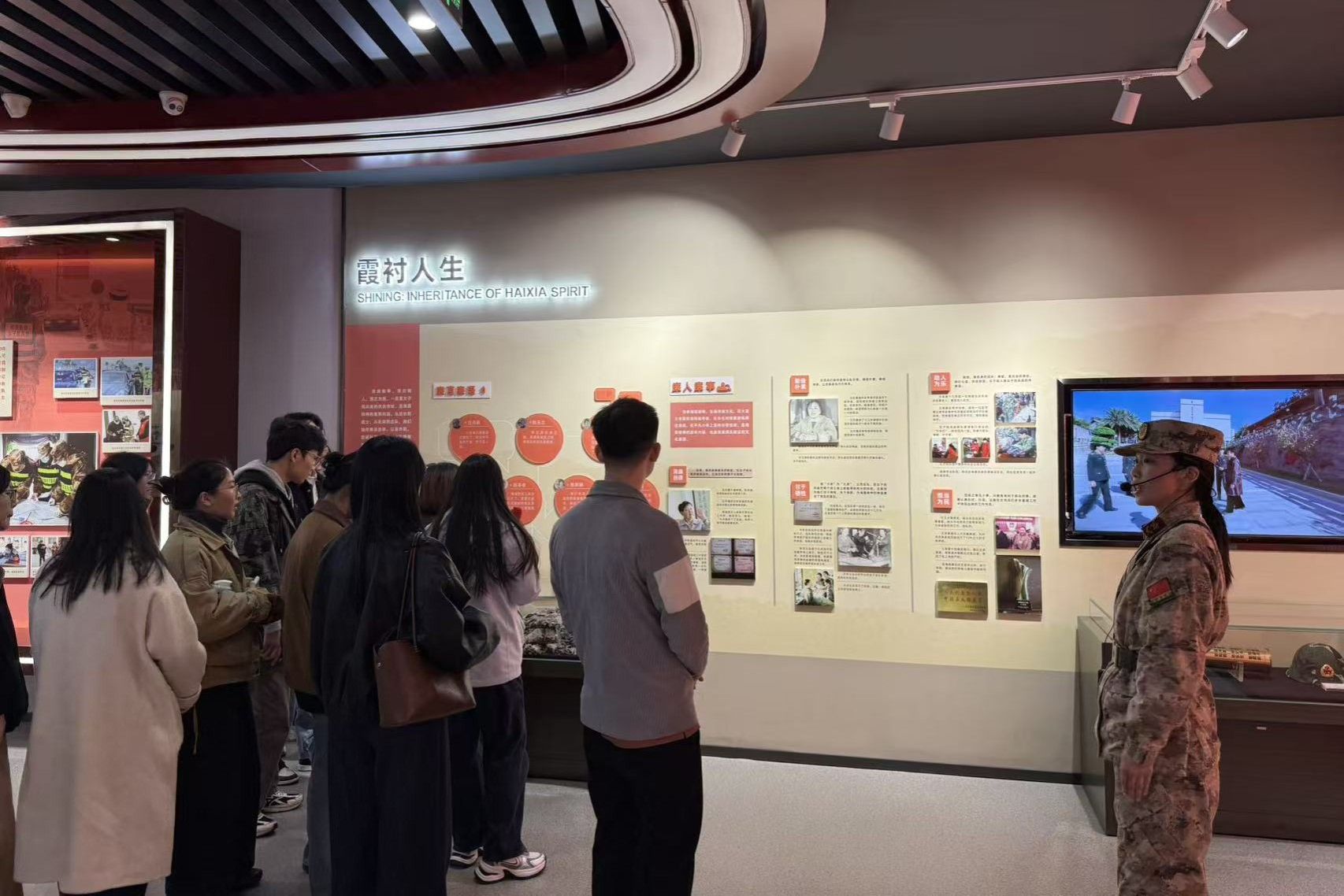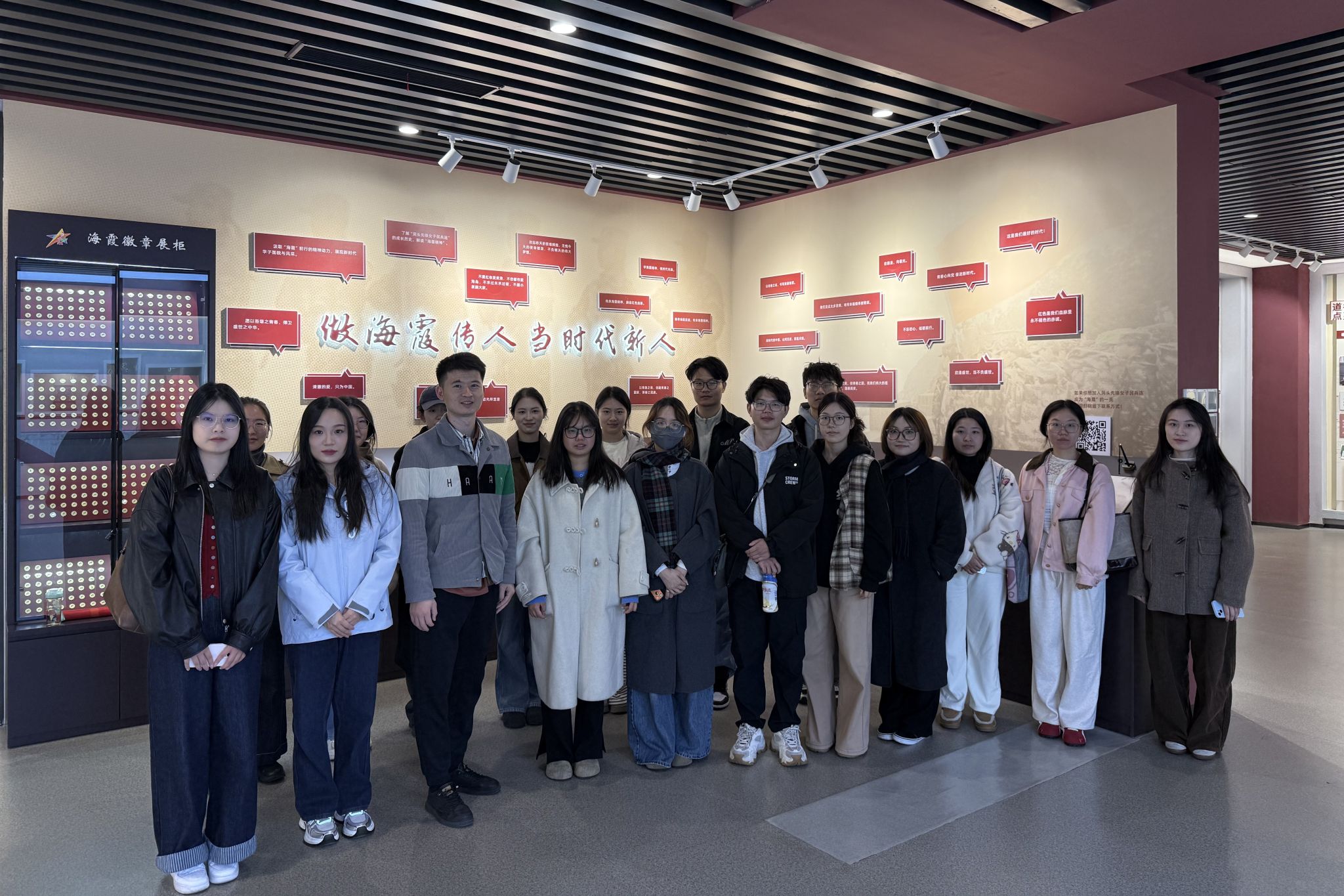 在讲解员的引导下,师生们沉浸于那段波澜壮阔的岁月。大家在一件件展品前驻足凝视,认真聆听女民兵们扎根海岛、保家卫国的感人事迹,深刻体悟“海霞精神”的时代内涵。从艰苦条件下的战备物资到熠熠生辉的荣誉奖章,从一张张写满坚定与青春的面庞到一代代赓续传承的精神火炬,每一个细节都震撼心灵、涤荡思想。师生们仿佛亲历了女民兵们顶风冒雨刻苦训练、不畏艰难忠诚守岛的动人场景,真切感受到她们“把青春献给海岛,把忠诚献给祖国”的赤子情怀,深刻认识到“巾帼不让须眉”的时代担当与“励志奉献”的精神实质。