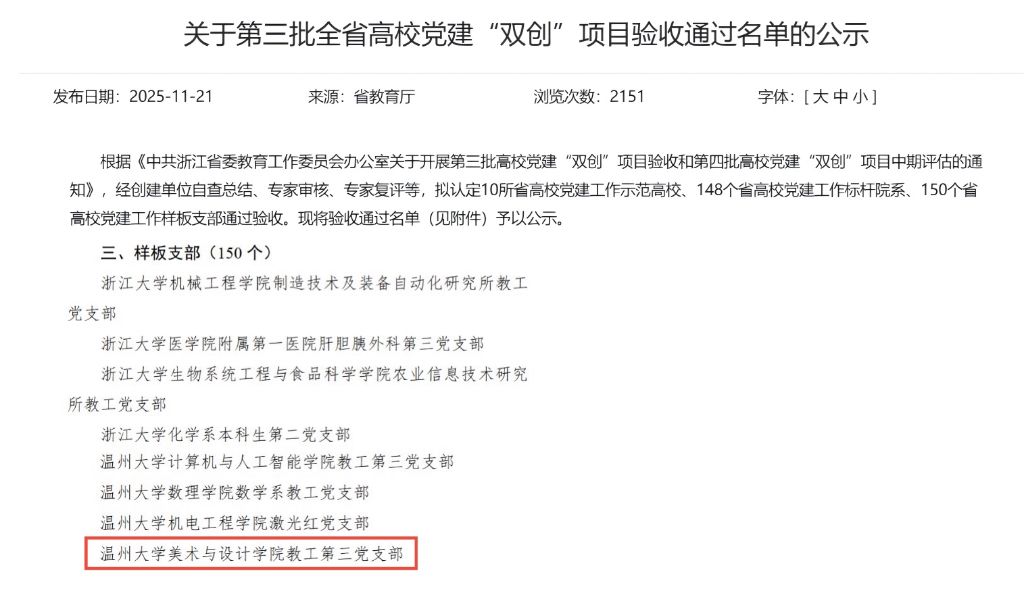 近日,中共浙江省委教育工作委员会发布《关于第三批全省高公司党建“双创”项目验收通过名单的公示》,公布了第三批全省高公司党建工作示范高校、标杆院系、样板支部验收通过名单。公司教工第三党支部2023年8月确定为第三批全省高公司党建“双创”培育创建对象,经过2年创建,顺利通过验收。