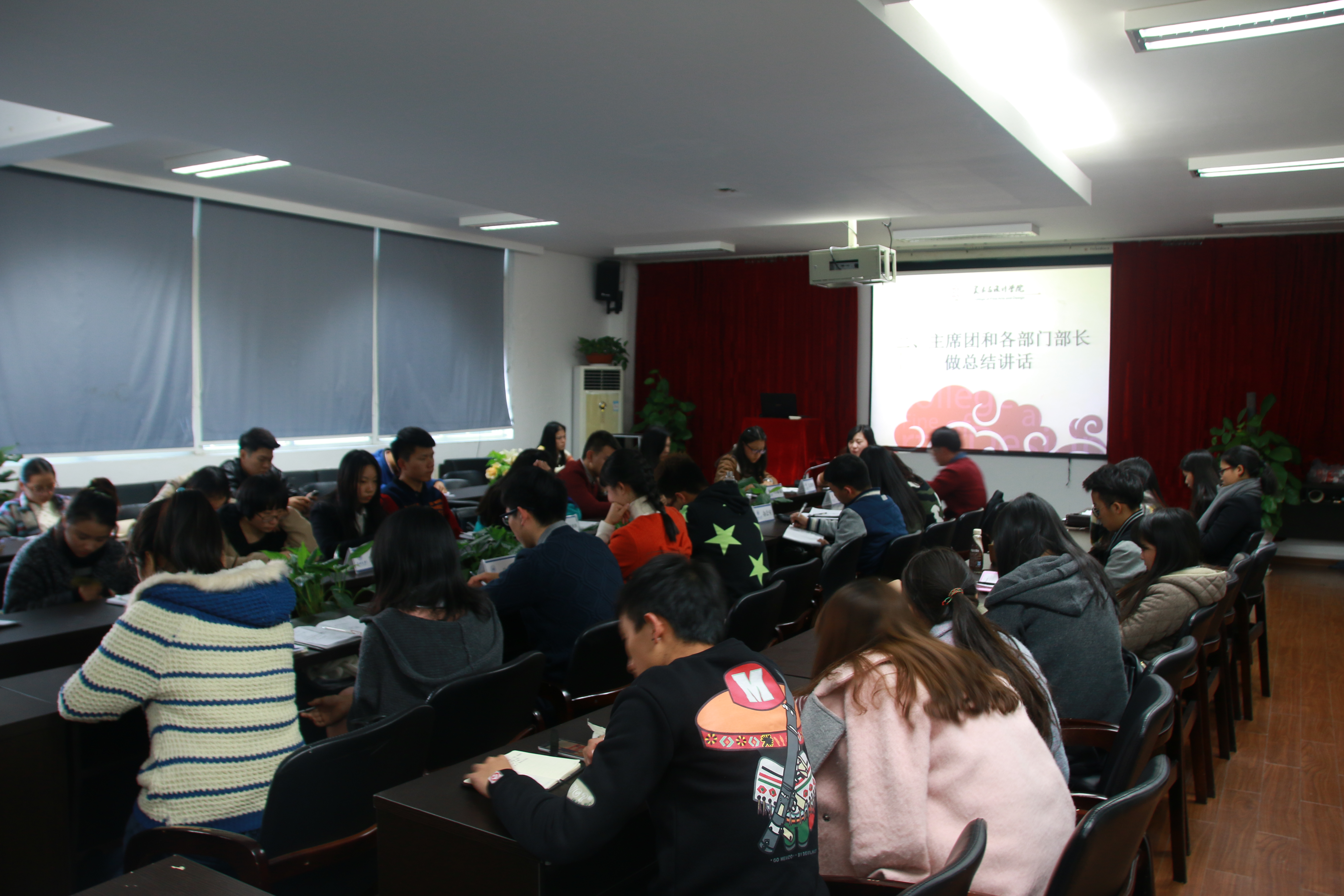 12月6日下午,公司团学第三次全体团学成员大会在美院2B4001如期举行。与会人员有公司员工科辅导员杜茜、团委副书记金李斌、员工会主席吴荣婷、员工会副主席叶佳颖、冯瑜瑜以及各部门部长与干事。