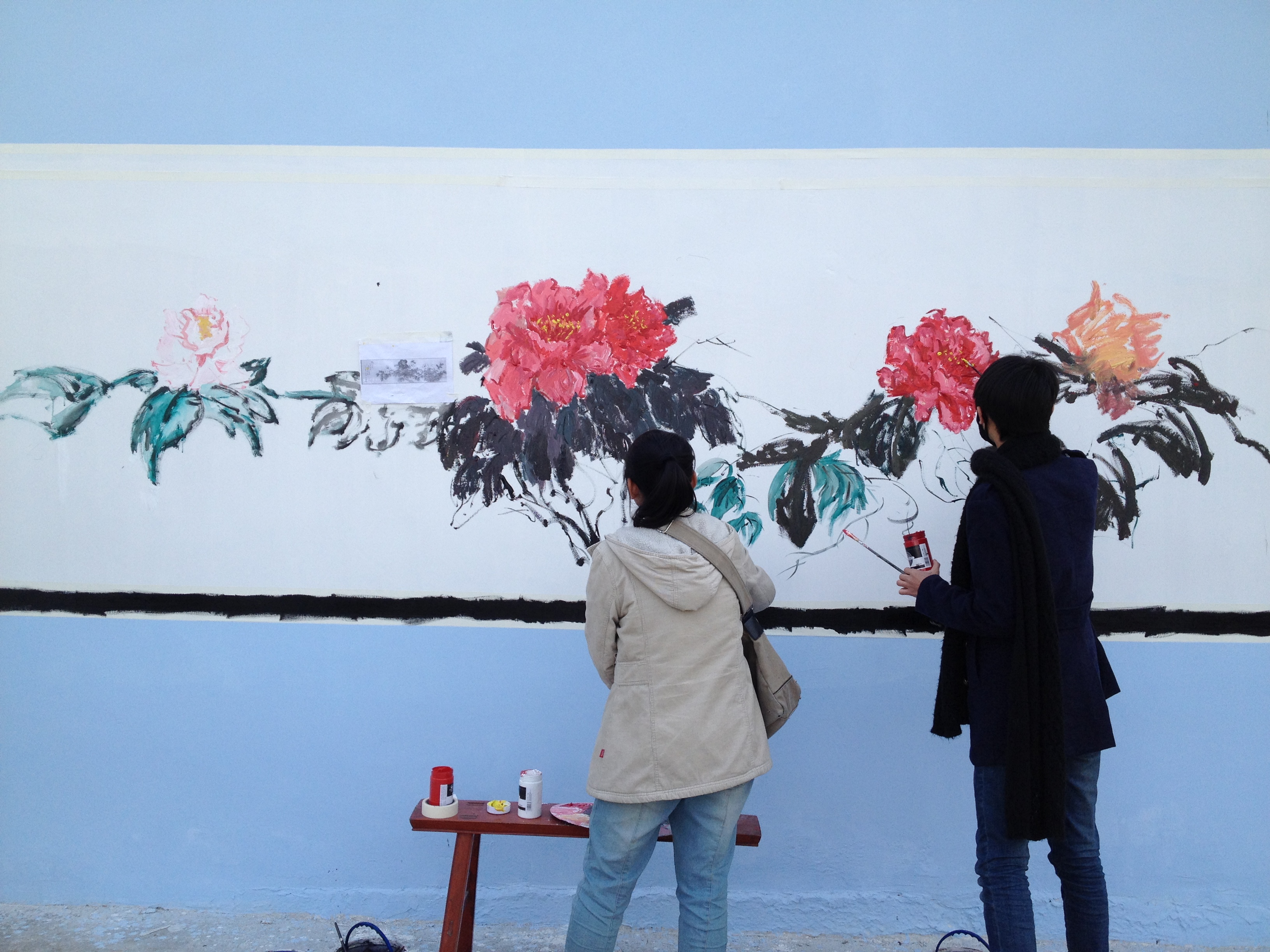 上午7点40分,尽管冬日的早晨有些寒冷,但是志愿者们还是准时集合出发。到达活动地点以后,志愿者们进行了简短的分组,每个小组领完作画工具后,迅速地投入到墙绘中。有的小组画山水水墨画,有的小组画梅兰竹菊图,还有的小组画花鸟图,图案丰富多彩。虽然活动场地寒风呼啸,但志愿者们的热情如春日的阳光,温暖着,感染着每个人认真投入到墙绘中。为了保证作画的质量,每个小组的志愿者在画之前都进行了深入的讨论:如何画?如何调色?如何上色?他们每画一笔必定稍作调整,力求完美。也因为他们的努力,这次墙绘活动画上了圆满的句号。
