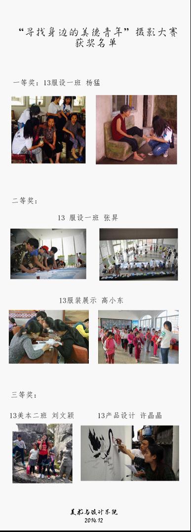 11月20日—12月1日,公司团学素质拓展部和设计宣传部联合开展了主题为“寻找身边的美德青年”的摄影大赛,本次活动特邀公司陈旭海老师和陈赛慧老师担任评委。 拍摄的画面中有开学季帮助大一新生搬行李指路的忙碌身影,有在敬老院给爷爷奶奶们递水、剪指甲的情形,有用画笔描绘五彩青春的画面,更有“一对一”教小朋友绘画的温馨瞬间......同学们用镜头捕捉下了这一幕幕精彩的瞬间,留住了点滴的温暖,使之成为寒冷冬天里一束温暖人心的光亮。 摄影是文明的手印,是记录,也是创造,它形象地记录发生在我们身边的点点滴滴,也让定格成为记忆里不可抹去的永恒瞬间。此次活动不仅为同学们提供展现自我价值的平台,也提高了当代老员工的情感修养、道德情操,为员工生活增添活气。 附:摄影比赛评选结果 一等奖: 13 服设一班 杨猛 二等奖: 13 服设一班 张昇 13服装展示 高小东 三等奖:13美本二班 刘文颖 13产品设计 许晶晶