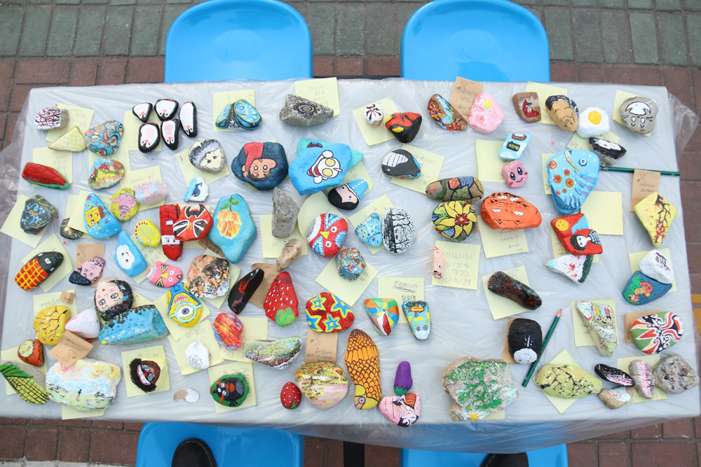 为了充分结合美术专业特长,融同学们艺术创新与健身锻炼为一体。学院团委员工会于上周末开启了“石绘心声”启动仪式,组织同学们到大罗山采集形状各异、可供绘制的石头。4月16日下午,员工会学风纪检部把从E区餐厅申请到的桌椅搬到活动场地,并将石头、画笔、画盘、颜料和水桶等各种绘画材料带至现场,引来过路员工的驻足围观,纷纷踊跃报名一展才艺。流畅的线条、斑斓的色彩加之参赛同学独特的创意,一块块普通的石头变成了精美雕琢过的艺术品。