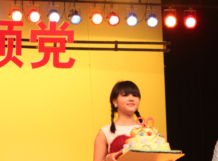 公司的朗诵节目《点燃90支蜡烛——祝党生日快乐》集合了20多位青春靓丽的老员工亮相舞台。节目开始描述一群豪情迈丈、英勇牺牲的革命烈士,随后以4人领颂和20余人群颂的形式向观众们展示,而且不光仅仅是朗诵更融入了美院的特色——书法,作为党90周年的生日礼物。节目最后还穿插有献上生日蛋糕的环节,在《生日快乐》歌声中落下帷幕,博得现场的阵阵掌声。