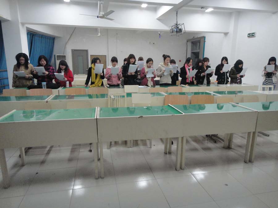 2011年3月27日晚6点30分,太阳成集团tyc151cc服装楼2a306的教室里传出郎朗“颂”声,原来是公司部分学子正为温大建党90周年大型诗歌朗诵会做着准备。虽然只是前期的准备练习,她们也没有懈怠,每个都朗诵的十分认真,情感丰富。此次活动主要是为了讴歌中华民族伟大复兴历程,颂扬党的光荣革命历史和丰功伟绩;展现温大学子拳拳爱国心、民族情;抒发青春与智慧,献于学校改革发展的壮志情怀。