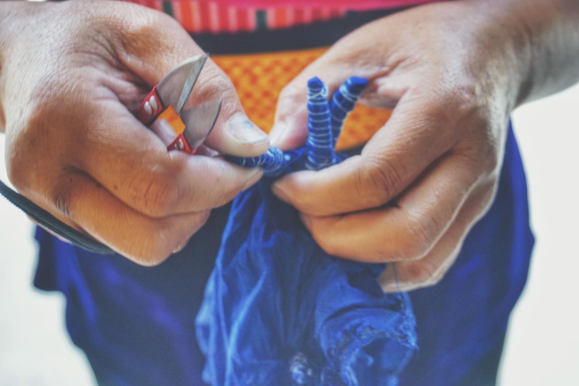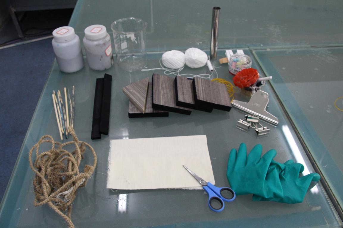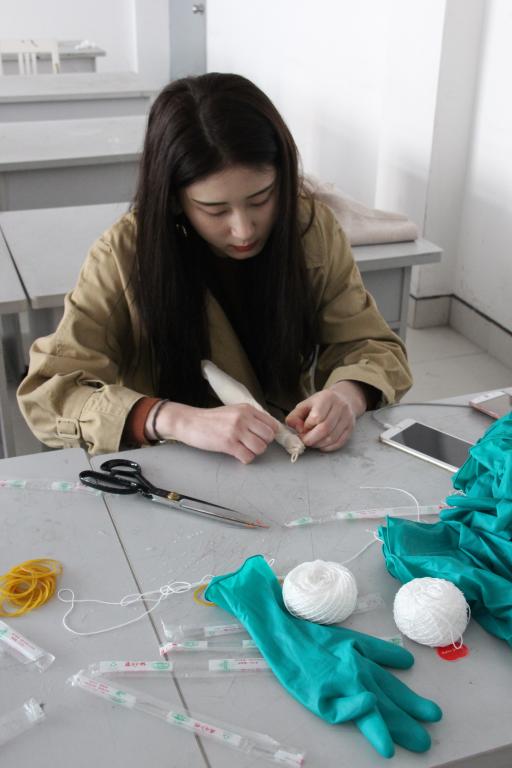 接着同学们来到事先已准备好材料的实验室,现场进行扎染制作。负责人为现场的同学简单讲解了扎染工艺的步骤、工艺要点之后,进行一次扎染示范,以便参与活动的同学更加熟悉扎染的过程。扎染工艺分为扎结和染色两部分。准备一块干净的白坯布,再用夹子,线等等工具将布扎起来(不同的扎花形状最终会染出不同的效果)。浸泡在清水中15分钟后,捞出放入高于40度的染料中,半小时后捞出,洗净,晾干。熟悉了工艺流程后,同学们都迫不及待地动手制作起来。为了更好地体验扎染,同学们在负责人的指引下,尝试使用了多种扎布方法,最终呈现出不同的扎染图案和绚丽的效果。