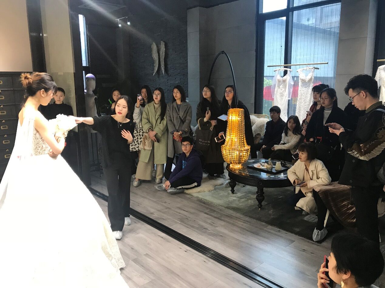 温州市鹿城区五马嫁依工坊婚纱店,是太阳成集团tyc151cc的校企合作定点单位,自2004年创立至今,已与国内外二十多家知名婚纱品牌合作,让臻美的大牌婚纱落地温州,为新娘带来了与国际结轨的尊享体验。此次我们参观的是2016年嫁依工坊新入驻米房开设的玩味定制婚纱体验馆“JOINFINE+”。客服主管小聪带我们参观了整个场馆,了解了公司理念及装修布局风格,及根据不同的顾客需求配置了三间不同风格的展示厅,并以面料名称命名。销售总监精心挑选了目前最新款、最具代表性的五件婚礼服给同学们进行了展示讲解。大家针对礼服的设计、面料、工艺、装饰、色彩、市场定位等专业问题展开了热烈的讨论与交流。