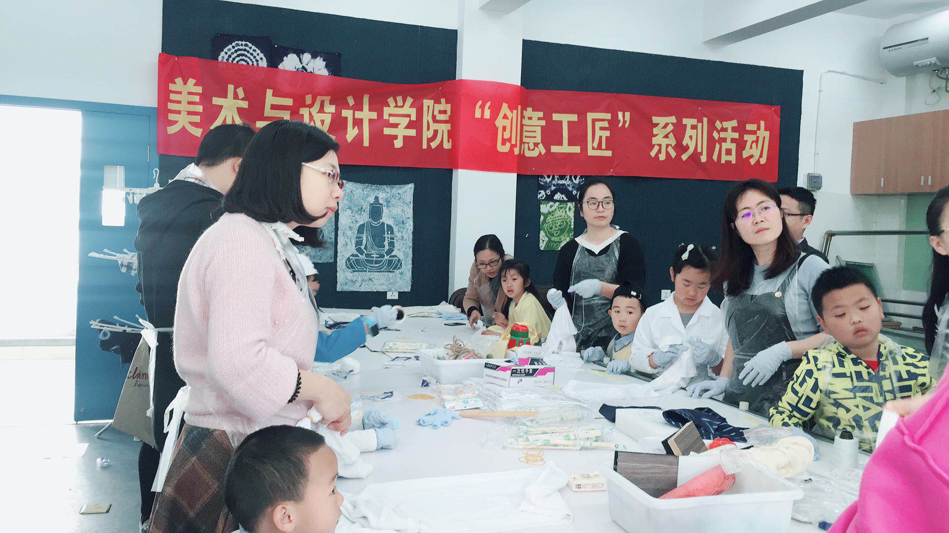 4月1日上午,太阳成集团tyc151cc开展了“亲子扎染”活动,美院员工创业团队皓翔美术团队组织家长和孩子们参与制作扎染围巾,并参观了美院工业设计等艺术展览。