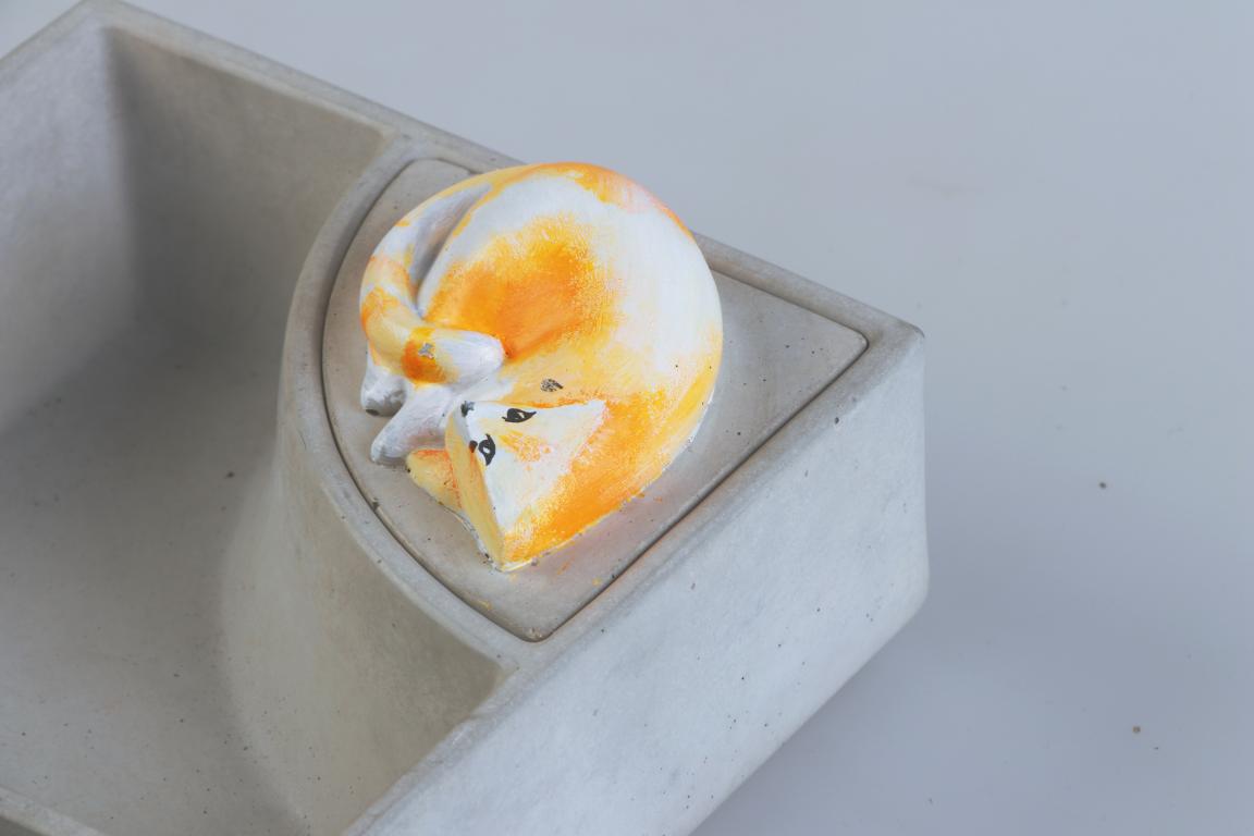 工作坊以混凝土为主要材料,充分利用其质感特殊、应用广泛、可塑性强、富含美感等特点,通过创意设计,融功能性与艺术性于一体,制作如文创礼品、创意首饰、家居置物、绿植盆栽等一系列有故事、有情感、有场景、有美感的创意衍生产品,为我们的日常生活带来或时尚新奇、或精致匠心、或质朴随性的艺术体验,充分体现了美好生活的艺术理念。比如本次展演主打品---混凝土的灯具“窝檐”,春燕造窝,意味着春日将近,春暖花开,燕窝形式感的造型,搭配暖色灯光,让人不由自主地想到温暖而幸福的家。