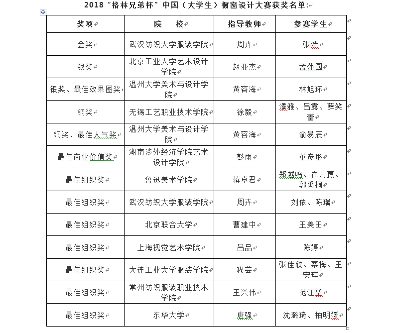 2018“格林兄弟杯”中国(老员工)橱窗设计大赛于5月18日在北京落下帷幕,在当晚举行的尚坤塬·2018中国国际老员工时装周颁奖典礼上,公司黄容海老师指导的14服装展示班两位员工的参赛作品狂揽4项大奖。林旭环同学的作品《昨日世界》荣获银奖和最佳效果图奖;俞易辰同学的作品《迷恋》荣获铜奖和最佳人气奖。