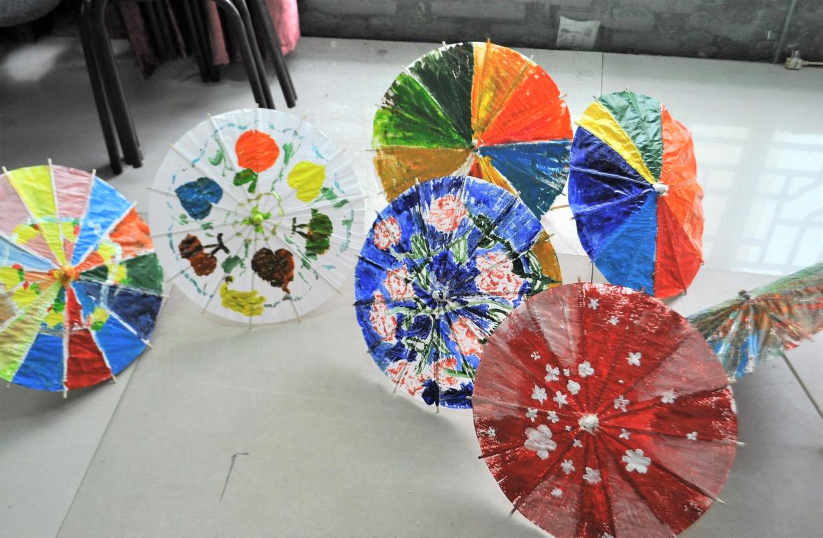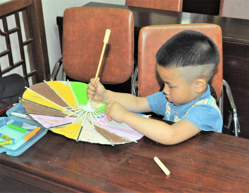 今天的天气没有像往日一样炎热,刚下的雨使得空气中有着淡淡的潮湿,志愿者们再次相约梅泉社区,给小朋友们带去欢乐。小朋友们人手一把小巧的空白油纸伞,在志愿者们的带领下准备好所需要涂鸦的丙烯颜料以及画笔,在一切准备就绪后,大家的情绪高涨起来,纷纷在伞上龙飞凤舞地画起来。有画梅花的,有画彩虹的,有画美少女战士的,还有抽象画!大家的想象力非常地丰富,油纸伞一张一收,美妙的画卷就在眼前绽开。当然,一番作画之后,小朋友们还可以领到小奖品。今天的梅泉,很快进入尾声,不禁感叹:快乐时光总是那么短暂。