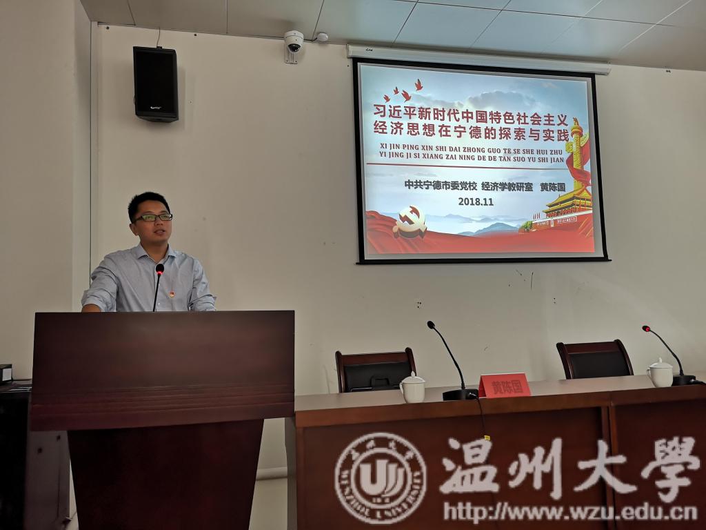 黄陈国以《习近平新时代中国特色社会主义经济思想在宁德的探索与实践》为主题做了一场生动的报告。他从五个方面系统讲述了习近平新时代中国特色社会主义经济思想在宁德如何探索、如何实践,即“五个一以贯之”。一、从经济大合唱,到党的集中统一领导(经济工作的根本保证一以贯之);二、从处理闽东经济关系,到完善宏观调(政府服务与市场理念一以贯之);三、从走大农业的路子,到乡村振兴战略(人民中心的根本立场一以贯之);四、从森林“三库”理念,到推进绿色发展(人与自然的和谐共生一以贯之);五、从滴水穿石精神,到稳中求进的策略(正确的经济工作方法一以贯之)。报告中融入了习近平主席在宁德工作期间的宝贵资政财富:深入基层,探索落后地区摆脱贫困的历史课题,倡导“滴水穿石”的奋斗精神、“弱鸟先飞”进取意识。