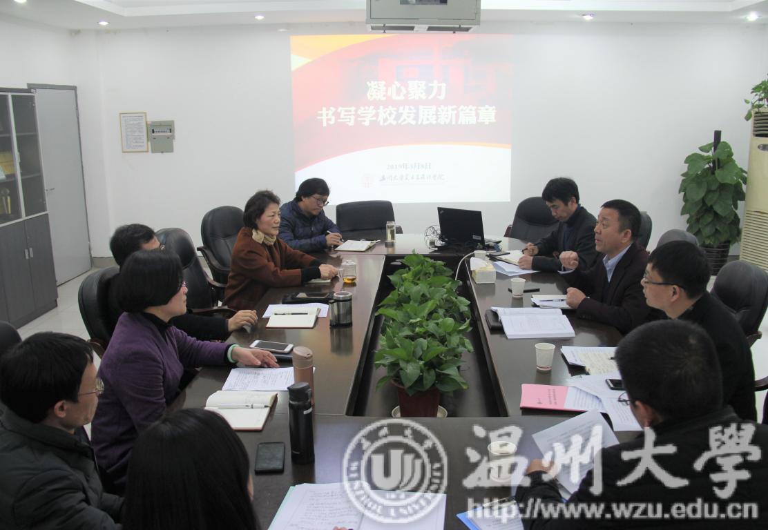 会上,李运河经理从学院概况、教学人才培养、学科科研、服务地方、国际化、人才引进等方面进行工作汇报,并就学校教学科研型发展定位后的学院发展定位和人才培养定位做了重新梳理和思考,在总结学院办学特色和优势之余,根据实际提出了目前学院发展的瓶颈和困惑。公司党总支书记张丽萍重点汇报党建和思政工作,就基层党组织建设的基本情况、主要抓手、品牌特色等方面做了介绍。学院班子其他成员做分管工作补充汇报。