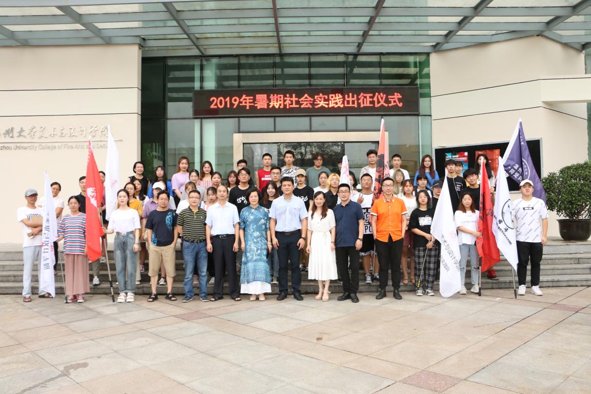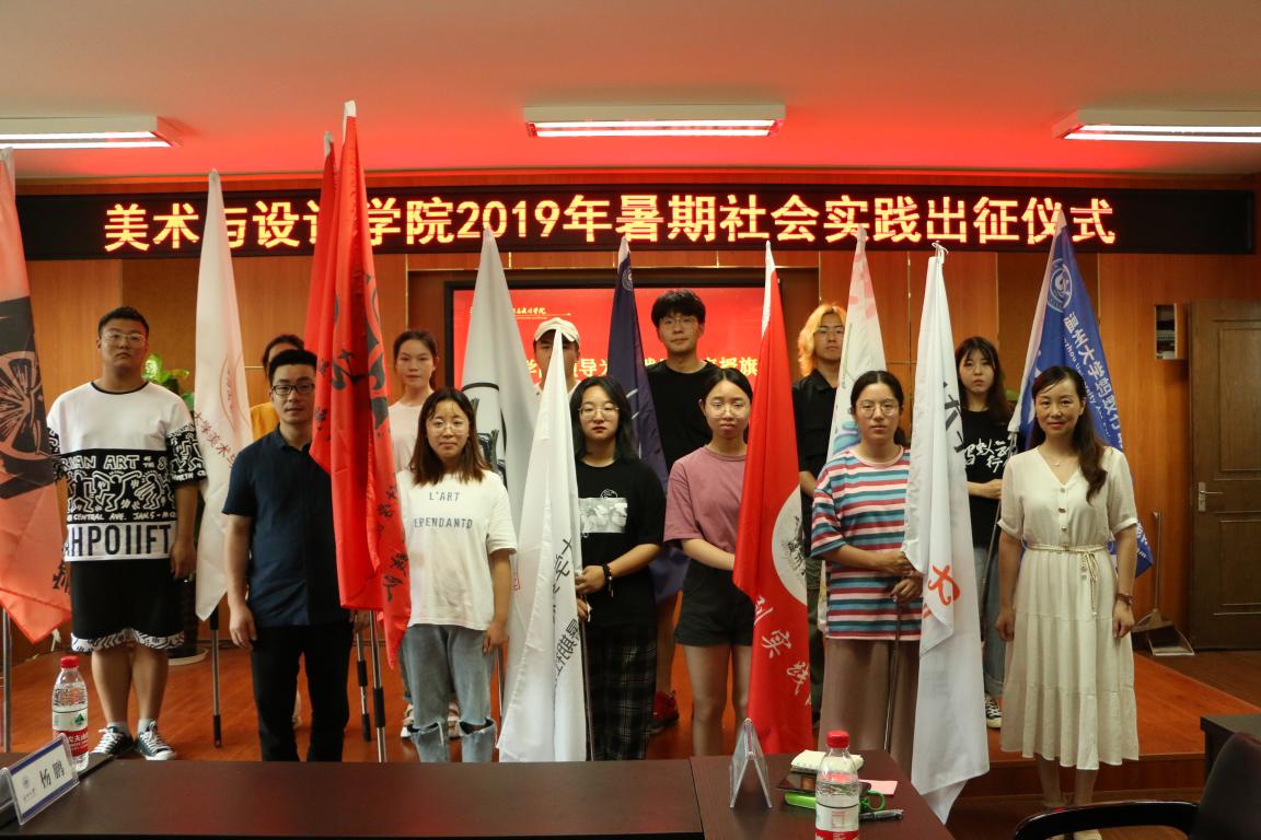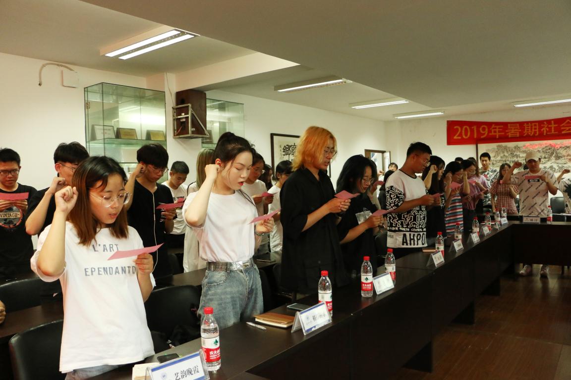 出征仪式全体宣誓,由2019年暑期社会实践员工代表崔泽渝领誓,全体同学宣誓,在庄严的誓词面前,同学们将更加坚定暑期社会实践的责任和信心。最后,学院领导为每个实践队授旗,本次活动也在美院正门的合照中,圆满画下了句号。