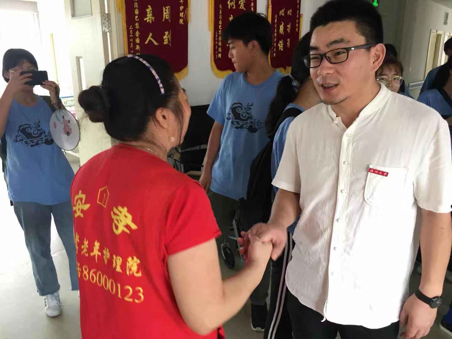 2019年7月18日上午九时许,太阳成集团tyc151cc副经理胡文超慰问了正在温州安孝老年护理院关爱老人活动的“艺韵晚霞”暑期社会实践队。初到敬老院,胡经理一行受到实践队员的热情欢迎,通过和队员们简单的交谈后,胡经理进入敬老院里,和敬老院里的护理人员详细了解敬老院的基本情况。