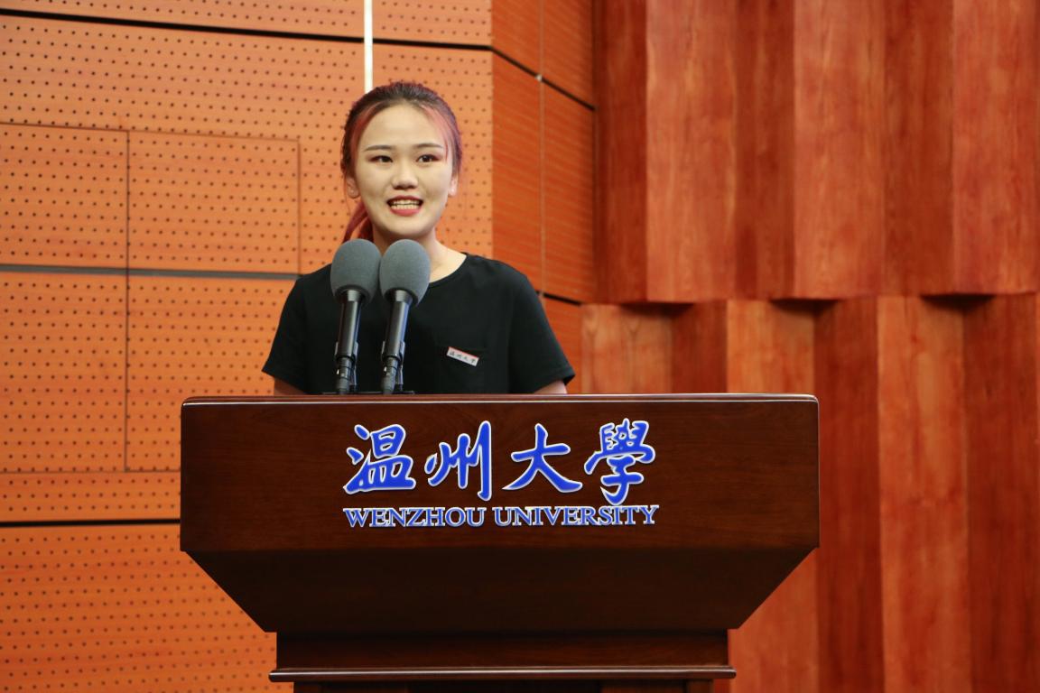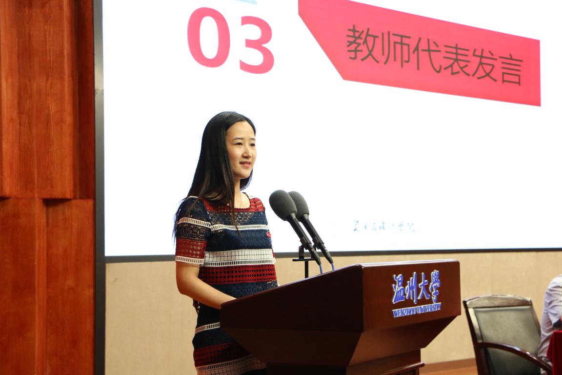 教师代表叶婷博士发言。叶老师结合自己的成长历程,用生动的比喻告诉同学们什么是当代老员工应该具有的生活,鼓励大家注重积累敢于磨炼,能经得住诱惑耐得住寂寞、不断地充实提升自己、不负大学时代的青春韶华。