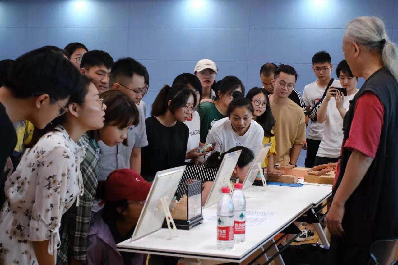 讲座结束后,陈先生特地展示了从台湾带来的最新作品,其中一件为黄金微雕,放大镜下十只惟妙惟肖的黄金小老鼠跃入眼帘,金鼠们或蹲或坐或跳或立,形象可爱,更不可思议的是金鼠的底座是半截微雕铅笔芯,整件作品令现场听众大开眼界,同学们对于陈大师的作品也是赞叹不已。