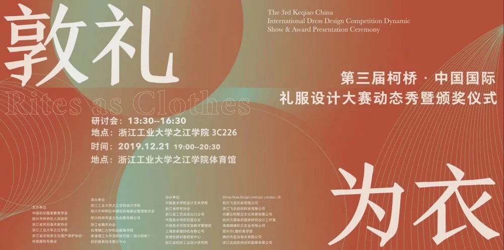 本次大赛由中国纺织服装教育学会,绍兴市柯桥区人民政府,浙江省民间美术家协会,浙江工业大学之江学院,浙江省非物质文化遗产保护协会传统服饰专委会主办,浙江工业大学之江学院设计学院,绍兴市柯桥区中国轻纺城建设管理委员会,绍兴柯桥布道文化创意有限公司,浙江省婚庆协会,台湾辅仁大学织品服装学院,香港理工大学深圳研究院(绍兴柯桥)纺织服装技术展示中心承办。
