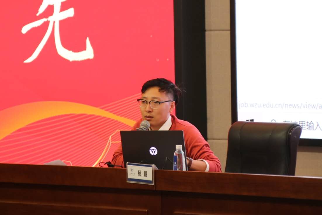 大会开始,学工办主任杨鹏老师先对就业手续、形势政策、就业 定位和应知概念等部分一一加以解读:详细讲解了公司就业系统、就业微信公众号的使用;分析了近几 年的毕业生就业形势,着重列出美院本科、硕士毕业生的就业和流向数据,为21届毕业生就业提供更多 参考;普及了毕业生应该知道的一些基本概念,提醒大家注意毕业、就业的重要时间节点,办理好三方 协议、就业劳动合同等。此外,杨老师还对毕业生留温、选调、自主创业、公司志愿服务西部计划和毕 业生困难补助等就业政策做了详细解读,并结合往年数据指导大家做出更准确的就业定位。最后,杨老 师提出老员工就职,忌贪心,忌急心,忌糊涂心,并通过实际案例对应届毕业生进行了就业安全的教育 。