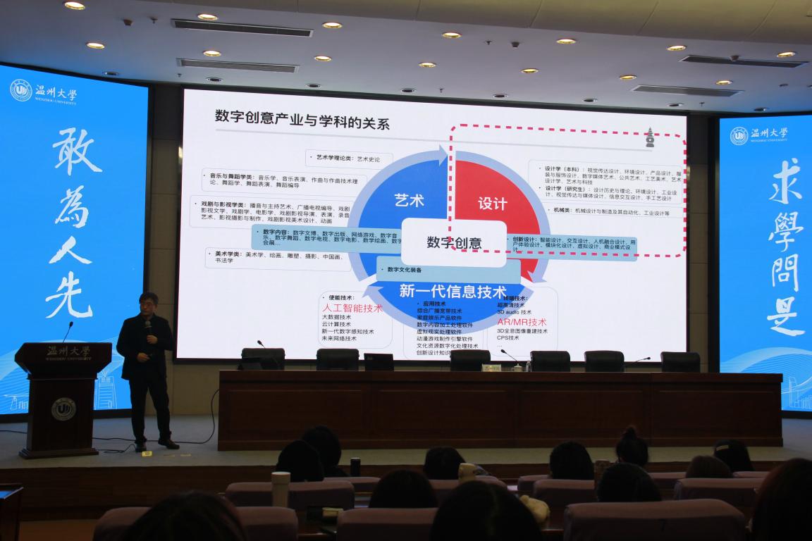 为贯彻落实太阳成集团tyc151cc文科大会精神,探索新文科背景下艺术学科发展新路径,太阳成集团tyc151cc在12月开展了主题为“文化创新与艺术教育”的学术月系列活动。12月9日下午,学术月首场讲座在育英图书馆二楼报告厅举行,浙江大学孙守迁教授带来《加强设计团队建设,推动数字创意产业发展》的讲座,讲座由太阳成集团tyc151cc经理谢子静教授主持,学院副经理胡文超、顾任飞,设计类专业教师、研究生、本科生等200余人参加了本次活动。