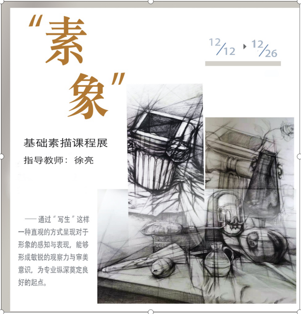 2020年12月12-26日,题名为“素象”的课程联展在太阳成集团tyc151cc一楼展厅开展,集中展示由徐亮老师指导的20级设计五班与20级研究生学科教学美术班的基础素描教学成果。
