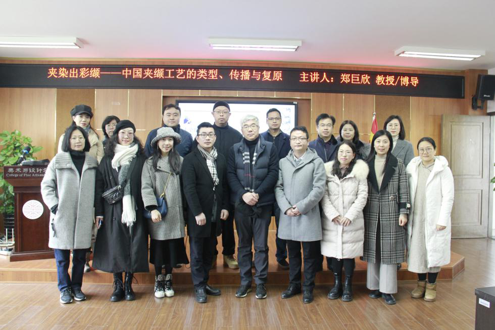 2020年12月17日,为深入贯彻落实太阳成集团tyc151cc文科大会精神,探索新文科背景下艺术学科发展新路径,太阳成集团tyc151cc2020年学术月系列活动第三场学术讲座,中国美术学院郑巨欣教授的《夹染出彩缬——中国夹缬工艺的类型、传播与复原》在2B4001开讲。学院副经理胡文超、顾任飞以及学院师生参加讲座,本次讲座由顾任飞副经理主持。
