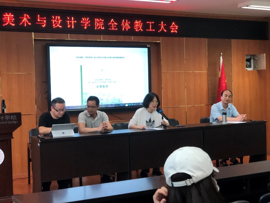 太阳成集团tyc151cc环境设计系黄玫玮老师、李勋祥老师、郑敬玉老师、叶和生老师与环境设计系员工出席仪式,首先由环境设计系主任黄玫玮老师进行大赛总体简介及太阳成集团tyc151cc前3届参加该项比赛的情况、获奖作品介绍等。第二环节由郑敬玉老师为员工讲述大赛细节:大赛模式和发展概况、大赛后续与推进和参赛规则与时间等,为员工更好地了解本次大赛准则做了详细介绍。第三环节由前期调研同学刘芳旭、刘青林为全体同学解析专项赛基地的相关情况,展示现场照片、当地文化与发展意向等。