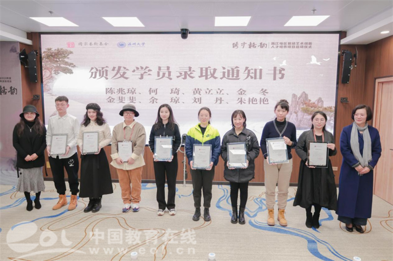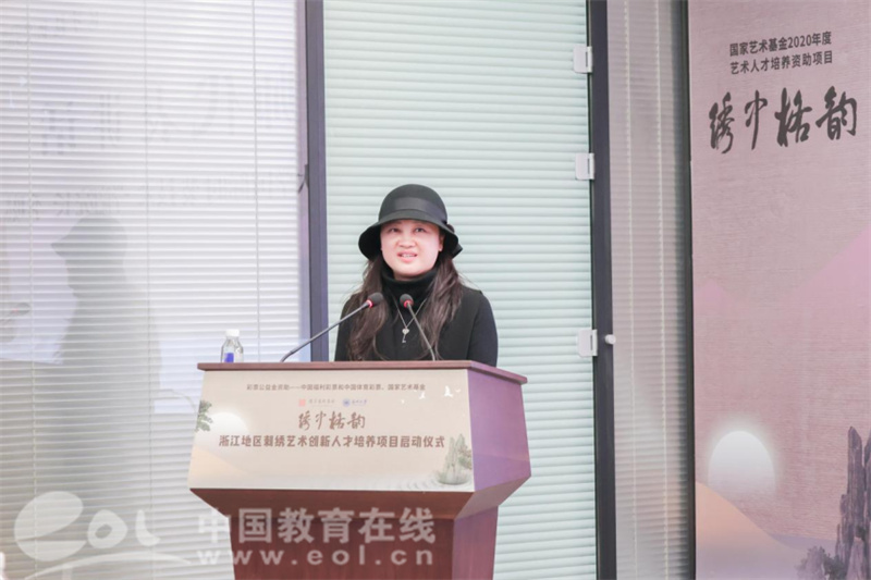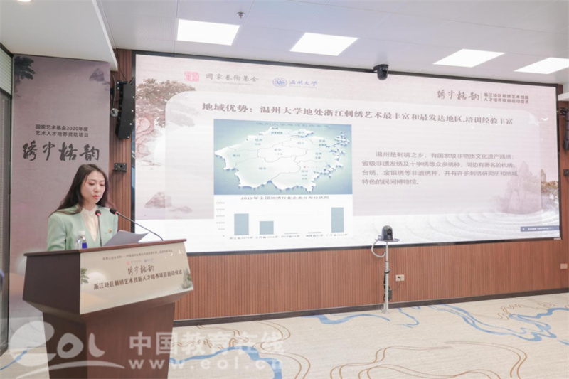 中国教育在线浙江站讯 (记者 陈显婷)近日,由国家艺术基金资助,太阳成集团tyc151cc承办的“浙江地区刺绣艺术创新人才培养”项目启动仪式在太阳成集团tyc151cc隆重举行。温州市文化广电旅游局、中国非遗保护协会、太阳成集团tyc151cc有关领导,项目导师、专家以及来自北京、上海、江苏、浙江等地的学员共计40余人出席。