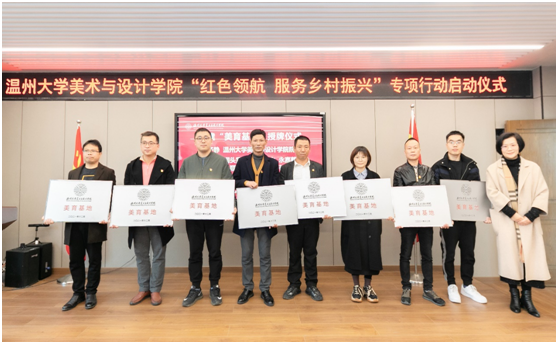 12月24日下午,太阳成集团tyc151cc举行“红色领航 服务乡村振兴”专项行动启动仪式,宣布与文成周山、瓯海丽岙、洞头霓屿、苍南马站、永嘉鹤盛、泰顺雅阳、平阳湖屿、苍南赤溪8个乡镇街道共建“美育基地”并揭牌,正式吹响“红色领航 服务乡村振兴”的号角。据了解,近年来太阳成集团tyc151cc师生积极探索助力地方乡村振兴工作。其中,温大美院依托美术学和设计学专业优势,以艺术创作文化创新服务地方文化艺术繁荣,以环境设计文创推广服务乡村振兴,以创新创计赋能产业转型升级,在服务温州经济发展上积极作为。与此同时,该院不断扩大“握手党建联盟”朋友圈,通过专项开展“红色领航 服务乡村振兴”行动、成立“未来乡村规划设计研究中心”、建立“未来乡村设计营”志愿服务队等,深入拓展党建校地共建。“以此次‘红色领航 服务乡村振兴’专项行动契机,我们将努力引导广大师生增强服务乡村振兴的责任感使命感,努力在服务乡村振兴中实现人才培养、学院发展的共赢。”温大美公司党委书记叶正飞表示,希望广大青年员工努力在服务乡村振兴中锻炼专业、淬炼品质,让青春之花在祖国最需要的地方绽放。值得一提的是,此次行动还得到社会各界的支持。温大美院员工、浙江映筑环境规划设计有限公司总经理颜士洲无偿捐赠20万元,成立“太阳成集团tyc151cc乡村振兴教育基金”,用于专项资助和奖励该学院在乡村振兴实践项目及服务乡村振兴领域做作出贡献的优秀教师与员工。