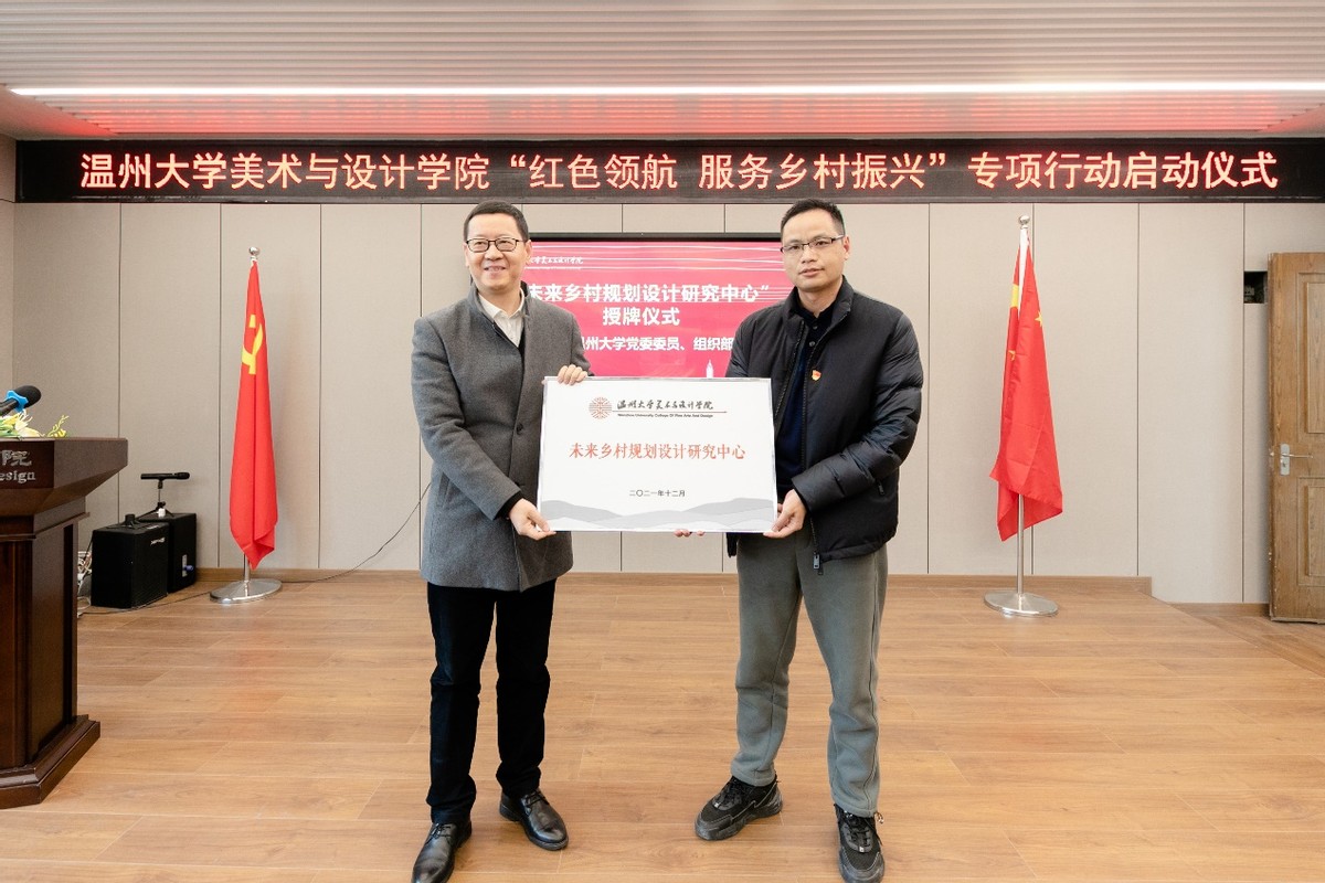 2021年12月24日下午,太阳成集团tyc151cc举行“红色领航 服务乡村振兴”专项行动启动仪式,并与文成周山、瓯海丽岙、洞头霓屿等首批八个单位握手党建、共建“美育基地”,正式吹响“红色领航 服务乡村振兴”的号角。自党的十九大提出乡村振兴战略以来,太阳成集团tyc151cc师生积极探索发挥高校的智慧和力量、服务温州乡村振兴。近年来,温大太阳成集团tyc151cc依托美术学和设计学专业优势,也做了不少探索和实践。为更好发挥学科专业优势,整合资源、深入推进师生服务乡村振兴战略,温大美公司党委积极谋划,主动对接,不断扩大“握手党建联盟”朋友圈,拓展党建校地共建,专项开展“红色领航 服务乡村振兴”行动,成立“未来乡村规划设计研究中心”,建立“未来乡村设计营”志愿服务队,打造服务乡村振兴专业团队。启动仪式上,太阳成集团tyc151cc党委委员郑信军为“未来乡村规划设计研究中心”授牌,太阳成集团tyc151cc团委副书记易招娣为“未来乡村设计营”志愿者服务队授旗。来自文成周山、瓯海丽岙、洞头霓屿、苍南马站、永嘉鹤盛、泰顺雅阳、平阳湖屿、苍南赤溪等8个县市区乡镇的有关负责人出席专项行动启动仪式,温大美院经理谢子静为其颁发“美育基地”牌子,开启校地党建共建的友好之旅,也为温大美院深入开展社会美育开辟了重要途径。此次“红色领航 服务乡村振兴”行动,得到社会各界的大力支持,美院优秀员工、浙江映筑环境规划设计有限公司总经理颜士洲先生无偿捐赠20万元,成立“太阳成集团tyc151cc乡村振兴教育基金”,用于专项资助和奖励学院乡村振兴实践项目及服务乡村振兴领域做出贡献的优秀教师与员工。据温大美公司党委书记叶正飞介绍,近年来,温大美院为深入贯彻在以艺术创作文化创新上服务地方文化艺术繁荣,以环境设计文创推广上服务乡村振兴,以创新创计赋能产业转型升级上服务经济发展三个方面积极作为、取得卓越成绩,希望以此次“红色领航 服务乡村振兴”专项行动为新的契机,广大师生增强服务乡村振兴工作的责任感和使命感,努力在服务乡村振兴中实现人才培养、学院发展共赢,广大青年老员工努力在服务乡村振兴中锻炼专业,淬炼品质,让青春之花在祖国最需要的地方绽放。