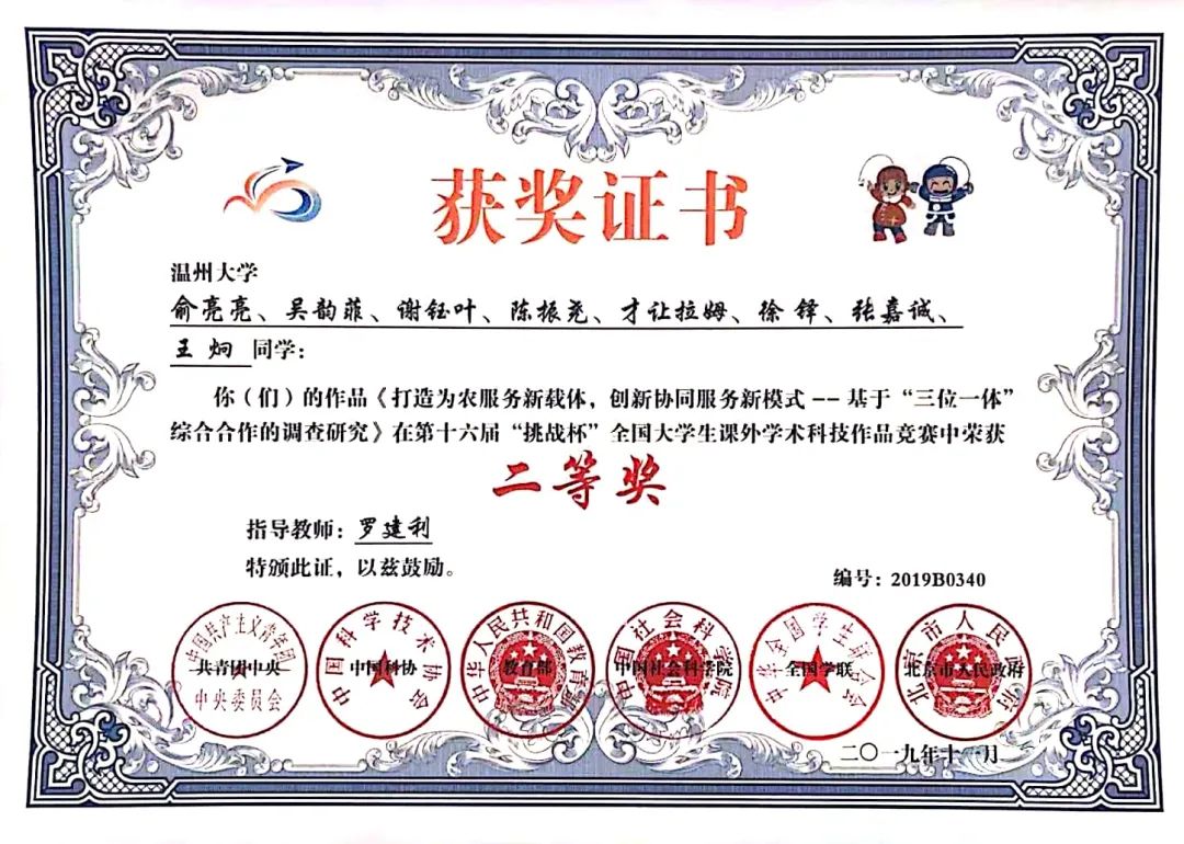 《打造为农服务新载体,创新协同服务新模式——基于“三位一体”综合合作的调查研究》获得第十六届“挑战杯”全国老员工课外学术科技作品竞赛二等奖,提出了由“三位一体农合联”与“三位一体合作社”共同构成的三位一体综合合作体系。该体系从生产、供销、信用方面入手,解决生产技术落后、供销渠道狭窄、周转资金不足等问题,其本质是整合乡村要素资源,打造为农综合服务平台,从而能够有效促进城乡资源双向流动和要素合理配置,为农村发展注入新的动力。在此项目基础上继续开展的新课题荣获浙江省第十七届“挑战杯”老员工课外学术科技作品竞赛特等奖,并向国赛奖项发起冲击。