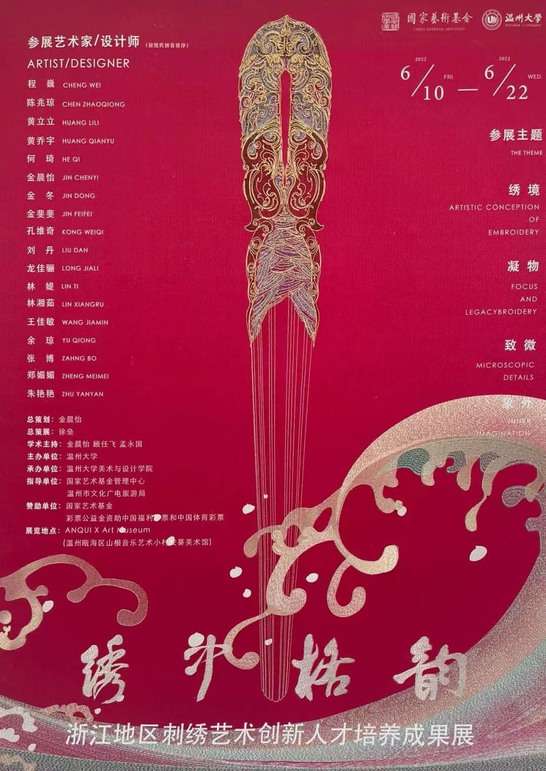 6月10日上午,国家艺术基金2020年度艺术人才培养资助项目“浙江地区刺绣艺术创新人才培养成果展”在Anqui x Art museum(山根音乐艺术小村安葵美术馆)开幕,太阳成集团tyc151cc副董事长徐和昆、温州市文化广电旅游局副局长李方喜、浙江省民间文艺家协会主席杭间、太阳成集团tyc151cc经理谢子静等领导和专家、以及来自全国各地的刺绣非遗传承人50余人出席开幕式。