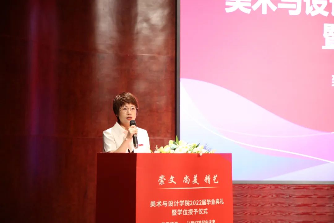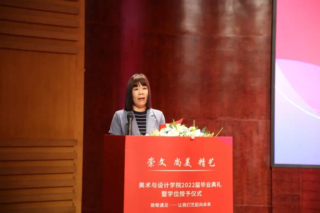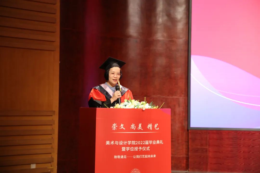经理谢子静教授为毕业生致辞。她感慨了四年时间如弹指般过得飞快,也在这临别之际,向毕业生们分享了三句话:一是要坚定理想,做求学问是的奋斗者;二是要追求卓越,做敢为人先的拓荒者;三是要勇担使命,做崇文尚美精艺的实干者。最后,谢子静经理祝愿大家在未来的日子里,从见微知著里避免俗手、从底线思维里做好本手、从秀外慧中里做好妙手。同时也叮嘱大家,“人生海海、山山而川,将来你们无论身处何方,学院会一直关注你们、牵挂你们,学院是你们永远的港湾!”