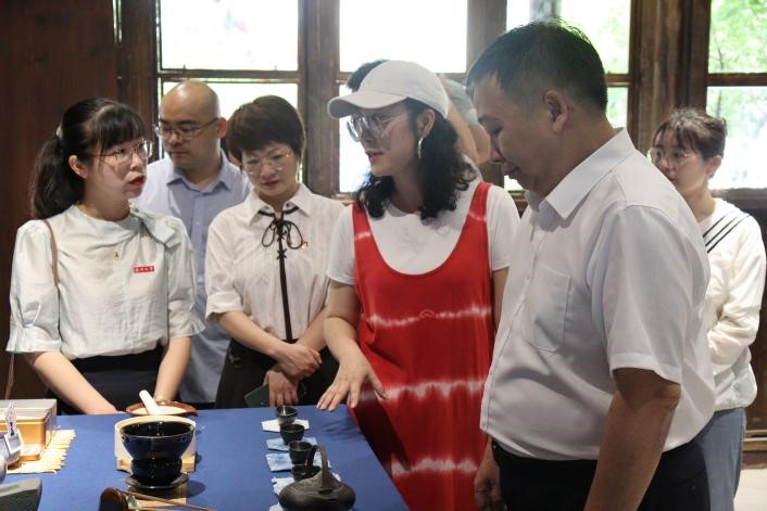 赵敏董事长先后参观了几个体验区域并仔细聆听了员工的介绍与实践心得。期间,员工展示了南戏研学项目、戏曲IP热转印和蓝染产品与宋式点茶的结合形式以及相关文创产品。赵敏董事长对于南戏与蓝夹缬同现代生活用品结合、蓝夹缬的再应用与灰染的结合、纯天然无污染的传统染色技艺表示了肯定,还亲自上手体验了一把蓝染的乐趣。