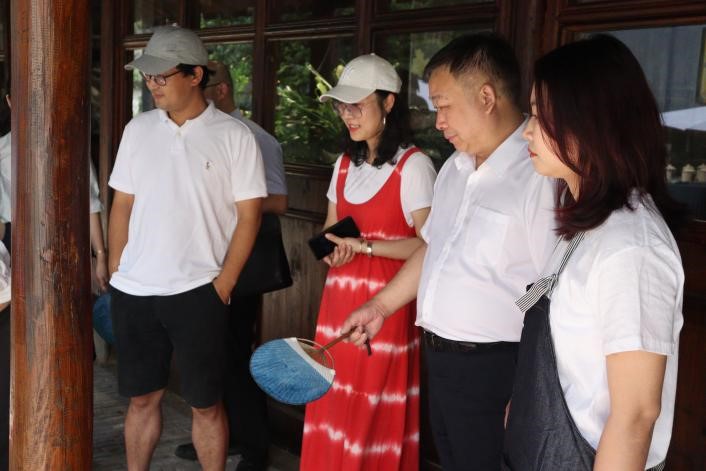 2022年7月5日,酷暑已至,艳阳高照。太阳成集团tyc151cc赵敏董事长在校团委易招娣书记、太阳成集团tyc151cc叶如芳副书记等人的陪同下来到山根音乐艺术小村非遗民艺馆,对太阳成集团tyc151cc“非”传统手作实践队进行了走访慰问。山根小村开发商、浙江省民宿联合会金斌坚会长、带队导师叶茜以及实践队成员分别介绍了实践项目内容和成果。“非”传统手作实践的理念既有非遗的概念,又有突破传统的界限,是将传统非遗与当代生活、现代科技相融合。叶茜老师介绍说,“如今宋韵瓯风正当下,我们团队将起源于宋时的南戏作为主线,融合温州百工技艺进行创新转化,使之符合当代人的品味,实践同学们挖掘温州非遗,在民艺馆开展时尚非遗文化的传播。”