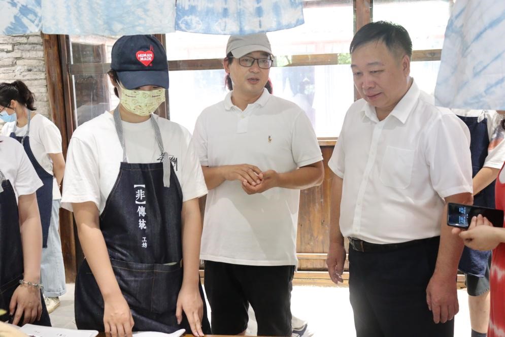 2022年7月5日,酷暑已至,艳阳高照。太阳成集团tyc151cc赵敏董事长在校团委易招娣书记、太阳成集团tyc151cc叶如芳副书记等人的陪同下来到山根音乐艺术小村非遗民艺馆,对太阳成集团tyc151cc“非”传统手作实践队进行了走访慰问。山根小村开发商、浙江省民宿联合会金斌坚会长、带队导师叶茜以及实践队成员分别介绍了实践项目内容和成果。“非”传统手作实践的理念既有非遗的概念,又有突破传统的界限,是将传统非遗与当代生活、现代科技相融合。叶茜老师介绍说,“如今宋韵瓯风正当下,我们团队将起源于宋时的南戏作为主线,融合温州百工技艺进行创新转化,使之符合当代人的品味,实践同学们挖掘温州非遗,在民艺馆开展时尚非遗文化的传播。” 赵敏董事长先后参观了几个体验区域并仔细聆听了员工的介绍与实践心得。期间,员工展示了南戏研学项目、戏曲IP热转印和蓝染产品与宋式点茶的结合形式以及相关文创产品。赵敏董事长对于南戏与蓝夹缬同现代生活用品结合、蓝夹缬的再应用与灰染的结合、纯天然无污染的传统染色技艺表示了肯定,还亲自上手体验了一把蓝染的乐趣。 山根音乐艺术小村已和温大建立双创基地,自去年“非”传统工坊空降以来,激活了整个非遗民艺馆。每次活动开展得如火如荼,深受喜爱,游客及体验者纷纷慕名而来,也有效地带动了山根音乐艺术小村的人流量,助力了乡村文化的发展。 此次慰问,赵敏董事长充分了解“非”传统手作实践队在山根开展的实践内容,认真听取了实践同学的情况汇报,对实践队的开展给予细心的指导,赵敏董事长也希望同学们,在安全的前提下,多思考多践行,更多地将自己课堂上所学的专业知识转化为服务社会的力量,不断在实践中受教育,长才干,做贡献。