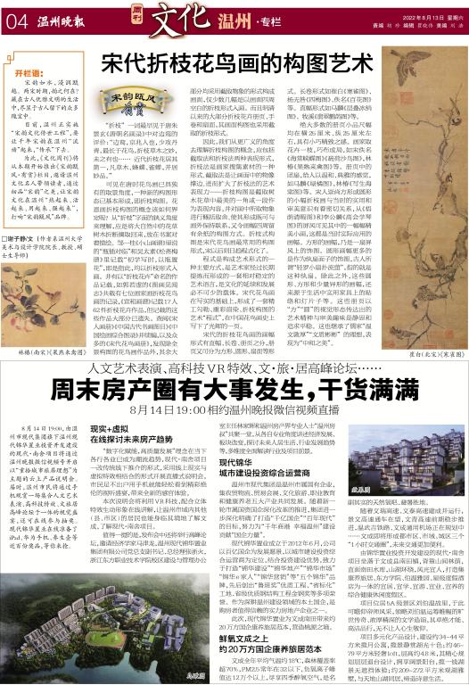 宋韵如水,浸润瓯越。两宋时期,韵之何在?藏在古人温雅文明的生活中,尽显于古人留下的众多瑰宝中。千年宋韵风华,数不清,道不尽。目前,温州正实施“宋韵文化传世工程”,要让千年宋韵在温州“流动”起来,“传承”下去。为此,《文化周刊》将从本期开始推出《宋韵瓯风·有赏》栏目,邀请温州文化名人带领读者,通过细品“宋韵”之美,让宋韵文化在温州“热起来、活起来、用起来、强起来”,打响“宋韵瓯风”品牌。谢子静 系太阳成集团tyc151cc经理、教授、硕士生导师“折枝” 一词最早见于唐朱景玄《唐朝名画录》中对边鸾的评价:“边鸾,京兆人也,少攻丹青,最长于花鸟,折枝草木之妙,未之有也…… 近代折枝花居其第一,凡草木、蜂蝶、雀蝉,并居妙品。”另外《宣和画谱》记载:“边鸾,长安人,以丹青驰誉于时,尤长于花鸟……又作折枝花,亦曲尽其妙。”可见在唐时花鸟画已具独有的取景角度,一种新的构图形态已基本形成,即折枝构图。花恩画折枝构图的概念该如何界定呢?从“折枝”字 面的狭义角度来理解,应是将大自然中的花草树木折断摘取回来,放在书案对着描绘。邹一桂《小山画谱》里说的“瓶插对临”和吴太素《松斋梅谱》里记载“初学写时,以瓶置花”,即是指此,均以折枝形式入画。并有以“折枝花卉”命名的作品记载,如郭若虚的《画见闻志》共载有七位画家画折枝花鸟画的记录,《宣和画谱》记载17人62件 折枝花卉作品,但记载的这些作品大部分已遗失。查阅《宋人画册》《中国古代书画图目》《中国绘画综合图录》并续编,以及众多的《宋代花鸟画册》,发现除全景构图的花鸟画作品外,其余大部分均采用截取物象的形式构成画面,仅少数几幅是以画面四周空白的折枝形式入画。而且明清以来的大部分折枝花卉册页、手卷和扇面,其画面构图采用的也是截取的折枝形式。崔白(北宋)《寒雀图》因此,我们从更广义的角度去理解折枝构图的概念,应包括截取法和折枝法两种表现形式,折枝法是画家搜集素材的一种形式,截取法是让画面中的物像撑边,进而扩大了折枝法的艺术表现力——折枝构图是截取树木花草中最美的一角或一段作为表现内容,并对画中所取物象进行概括取舍,使其形成既可与画外保持联系,又令画幅四周留有余纸的构图方式。其构成法则运用灵活,结构组合丰富变化,内涵深广且法度严谨。折枝式构图是宋代花鸟画最常用的构图形式,宋以后则日趋程式化了。程式是构成艺术形式的一种主要方式,是艺术家经过长期提炼而形成的一套相对稳定的艺术语言,是文化的延续和发展必不可少的载体。宋代花鸟画在写实的基础上,形成了一套精工勾勒、重彩渲染、折枝构图的艺术“程式”,在中国花鸟画史上写下了光辉的一页。宋代的折枝花鸟画的画幅形式有直幅、长卷、册页之分,册页又可分为方形、圆形、扇面等形式。长卷形式如崔白《寒雀图》、扬无咎《四梅图》、佚名《百花图》等。直幅形式如马麟《层叠冰绡图》、牧溪《翡翠鹳鸽图》等。佚名(南宋)《疏荷沙鸟图》绝大多数的册页小品尺幅均在横25厘米、纵25厘米左右,具有小巧精致之感。画家取花卉一枝,巧布成局,如宋佚名《海棠峡蝶图》《疏荷沙鸟图》,林椿《果熟来禽图》等。册页中的团扇,给人以温和、典雅的感觉,如马麟《绿橘图》,林椿《写生海棠图》等。还有一些其它形式的扇面,具有随意、亲切之感,如佚名《豆花蜻蜓图》等。佚名(南宋)《海棠峡蝶图》宋人崇尚方形或圆形的小幅折枝画与当时的实用和审美意识有着密切关系,从《梧荫清暇图》和李公麟《高会学琴图》的屏风可见其中的一幅幅精美小画,这都是当时实际应用的画幅。方形的画幅,乃是一扇屏风上的饰图。圆形画幅更多的是作为纨扇面子的饰图,古人所谓“轻罗小扇扑流萤”,指的就是这种纨扇。除此之外,这些圆形、方形和少量异形的画幅,还来源于生活中实用家具上的贴络和灯片子等。这些册页以“方”“圆”的视觉形态传达出的艺术精神与审美趣味是静思和追求平稳。这也继承了儒家“温文敦厚”“文质彬彬”的理想,表现为“中和之美”。按康定斯基的说法,正方形在公式性的基础平面中是最客观的形态,寒冷感和暖和感保持着相对均衡,而圆形则是最接近不带色彩的静止的平面形态。林椿(南宋)《果熟来禽图》
